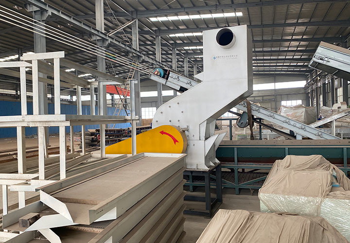 破碎線主機殼體采用特厚鋼板制造,內(nèi)襯為高錳鑄鋼件,可更換;主機轉(zhuǎn)子盤安裝于水平軸上,轉(zhuǎn)子盤圓周分布有銷軸,軸向懸有錘頭;主軸用滾珠軸承支撐,循環(huán)油強制潤滑冷卻,并裝有溫度傳感器;進料口裝有液壓輥筒喂料裝置,位置一高一低,同向旋轉(zhuǎn),能將大件松散物料壓扁,送入破碎腔內(nèi)。