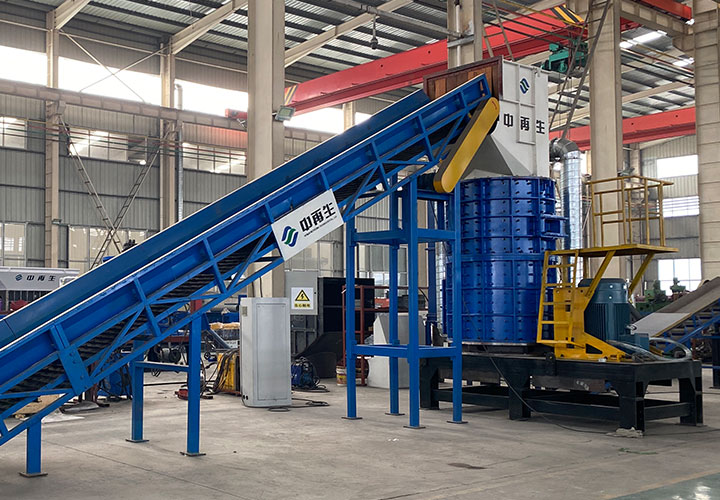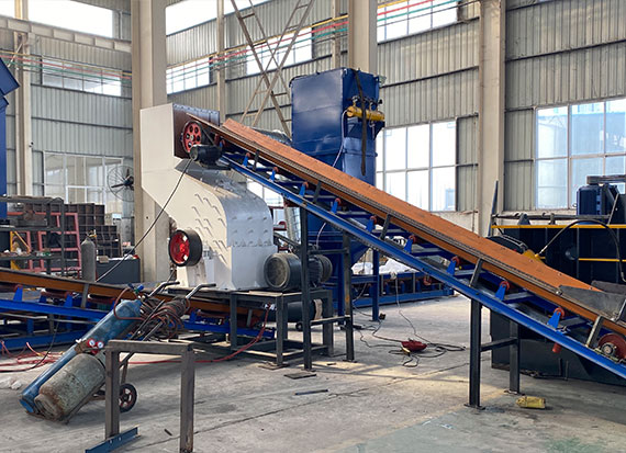 破碎線主機殼體采用特厚鋼板制造,內襯為高錳鑄鋼件,可更換;主機轉子盤安裝于水平軸上,轉子盤圓周分布有銷軸,軸向懸有錘頭;主軸用滾珠軸承支撐,循環油強制潤滑冷卻,并裝有溫度傳感器;進料口裝有液壓輥筒喂料裝置,位置一高一低,同向旋轉,能將大件松散物料壓扁,送入破碎腔內。